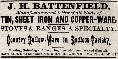 A notice was given in 1875 that the firm of Battenfield & Fowler was dissolved.[16] In 1880, Joseph is recorded working as a "tinner."[17] He opened a new "stove and tinshop" that summer.[18]