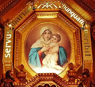 In 1915, a teacher gave Kentenich a picture of the Virgin and Child. The tenderness of Mary's gesture impressed him and he placed the icon above the altar. Venerated under the name Mater ter admirabilis (Mother Thrice Admirable), the picture appears in every Schoenstatt site.[8]