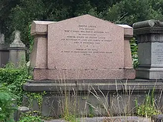 Joseph Locke died on 18 September 1860,[11] apparently from appendicitis, whilst on a shooting holiday. He is buried in London's Kensal Green Cemetery. He outlived his friends/rivals Robert Stephenson and Isambard Brunel by less than a year; all three engineers died between 53 and 56 years of age, a circumstance attributed by Rolt to sheer overwork, accomplishing more in their brief lives than many achieve in a full three score and ten.