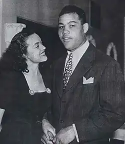 While training for a fight against Lee Ramage, Louis noticed a young female secretary for the black newspaper at the gym. After Ramage was defeated, the secretary, Marva Trotter, was invited to the celebration party at Chicago's Grand Hotel. Trotter later became Louis's first wife in 1935.[14]