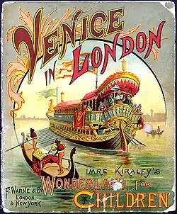 Between 1891 and 1893 they staged Venice in London, a spectacular, at the Olympia,[6] which combined catering by Lyons, entertainments and opportunities to purchase souvenirs with a stage show. Theatrical impresario Imre Kiralfy, who specialised in such events, designed and directed the show and lent his name to the production to increase its public appeal.[7] It required the import of 100 gondolas from Venice with Venetian gondoliers.[8] According to The Times, 4,893,980 people visited the event in its first year with 24,737 visiting on Boxing Day 1892.[9]