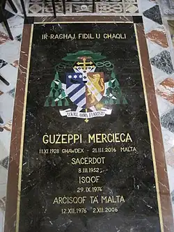 Five years later Pope Paul VI appointed him Auxiliary Bishop of Malta to assist Archbishop Gonzi.[6] He was consecrated bishop by His Excellency Sir Mikiel Monsignor Count Gonzi, Archbishop of Malta, on the feast of St Michael in St. John's Co-Cathedral, Valletta. After Archbishop Gonzi retired in 1976, Bishop Mercieca succeeded him. He spent the next thirty years as the spiritual shepherd of the Archdiocese of Malta.