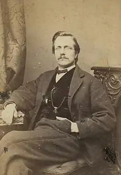 In August 1868 Parry and his family arrived in England, where he began a three-year study at the Royal Academy of Music under William Sterndale Bennett and Manuel Garcia.[7] During his last year of study at the Royal Academy, Parry appeared before Queen Victoria three times, each time by her special request. The Queen made another request of Parry each time he appeared: that he perform only works he had composed.[10] In 1871, Bennett convinced Parry to enter University of Cambridge for a degree in music.[7][17][d] While at Cambridge, Parry became the first Welshman to take both the MusB and MusD there.[1] After earning his bachelor's degree, Parry and his family returned to Danville, where he operated a school of music for the next three years.[7][18] When Aberystwyth University established a chair for music, it was offered to Parry; he moved his family back to Wales, becoming the university's first professor of music.[7][19][1][e]