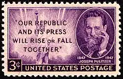 Joseph Pulitzer (/ˈpʊlɪtsər/ PUUL-it-sər;[2][a] born Pulitzer József, Hungarian: [ˈpulit͡sɛr ˈjoːʒɛf]; April 10, 1847 – October 29, 1911) was a Hungarian-American politician and a newspaper publisher of the St. Louis Post-Dispatch and the New York World. He became a leading national figure in the U.S. Democratic Party and served one term representing New York's 9th congressional district.