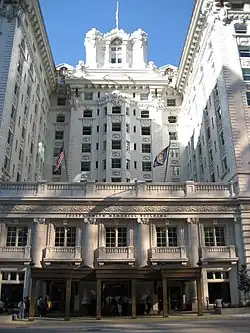 The ten-story building has a concrete and steel structure and is covered with white glazed terra cotta and brick. Various additions and remodelings have occurred throughout the years, including a substantial expansion to the north and modifications to the roof-top dining facilities.