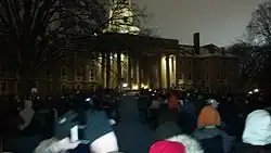 On the night of November 8, hundreds of students gathered in front of Paterno's home in support of Paterno. Paterno thanked the crowd and said, "The kids who were victims or whatever they want to say, I think we all ought to say a prayer for them. It's a tough life when people do certain things to you."[71][72] As Paterno began walking back into his home with the crowd chanting "Let Joe Stay," he turned around to instead lead the crowd in "We are Penn State" cheers,[73] which unnamed members of the Penn State Board of Trustees viewed as insensitive.[2] Within days of the scandal breaking in full, speculation was rife that Paterno would not be allowed to return as head coach. On November 9, Paterno announced that he would retire at the end of the season, stating: