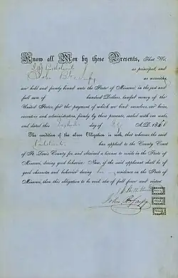 Not much is known about Postlewaite's early life.[5] When Postlewaite moved to St. Louis, Missouri was still a slave state, but slavery was declining in the city at that time. From 1850 to 1860, the overall population of St. Louis doubled in size, but the number of slaves decreased by almost half.[6] The labor pool in St. Louis expanded with the arrival of European immigrants, and the need for slaves diminished. This affected free blacks as well, deteriorating their economic position. At that time, all "free colored" were required to post bond for a license to live in the state of Missouri. When Postlewaite arrived in St. Louis, at age twenty-one, as a free man, he applied for this bond.[2] John B. Sarpy, a wealthy fur-trade executive signed the bond, though Postlewaite's relation with Sarpy's family is unknown.[5] Postlewaite's bond is notable because most individuals signed their bonds with an X, but Postlewaite signed his bond himself, and with the signature of a cultured individual.[4] Missouri was fairly lenient with regard to the education of black residents, a rarity for a slave state. The availability of limited education for black residents, along with the tradition of black musicians performing for white audiences allowed Postlewaite to achieve success as a black musician during this time.[5]