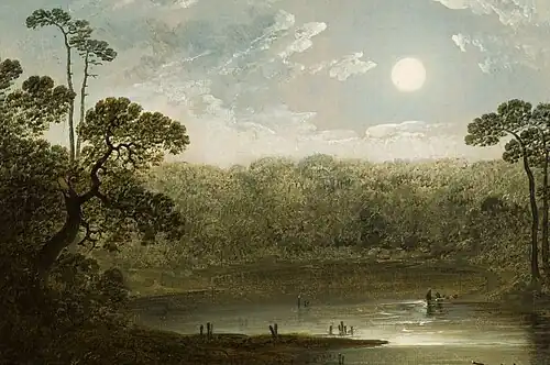 Shaw's landscape paintings were picturesque in style, a logical result of his English training. His landscapes typically included "a dark foreground, generalized trees or hills framing the composition in the foreground and middleground, a stream or lake, and distant hills. All of these elements are a direct influence of Claude Lorraine's 17th-century idealized landscapes of the Roman countryside."[3] Claude Lorraine, in turn, was an influence on 18th and early 19th century British landscape painters.