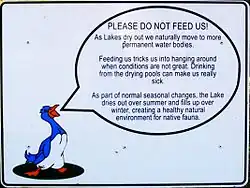 The lake is contained within Shenton Park, a parkland in the suburb of Shenton Park, bounded by Lake Avenue, Excelsior Street, Evans Street and Herbert Road. As well as the lakes themselves, the park area includes open grassed space, barbecues and playground equipment and a masonry building and public toilet in the south-west corner. The lake is generally full during the winter rainy season, but can dry up completely during the summer months. A variety of birdlife (including the famous black swan) can be found around the lake, as well as a number of aquatic creatures such as turtles.[1]