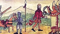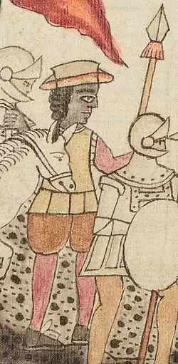 He is considered the prime example of black conquistador, although in reality the presence of Africans and mulattos in the Hispanic ranks had already become a widespread occurrence after the first decade of the 16th century.[4] Other examples of black conquistadors included Beatriz de Palacios, Juan Valiente, Juan García Pizarro, Juan de Villanueva, Pedro Fulupo and Antonio Pérez.[5][6] The presence of black people was shocking to Mesoamericans, who called them teucacatzactli ("black deities") in Nahuatl.[7]