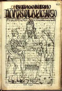 ![]() Solano sealing the marriage of Sayri Túpac (from the Nueva Corónica y Buen Gobierno by Felipe Guaman Poma de Ayala) | |