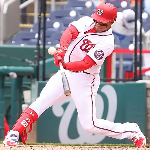 Soto debuted with the Washington Nationals on May 20, 2018, and quickly established himself as one of MLB's brightest stars, batting .292/.406/.517 with 22 home runs and 70 RBIs as a rookie. He earned an All-Star selection, finished second in NL Rookie of the Year voting, and played a key role in the Nationals' World Series victory, hitting .333 in the postseason.[34] In 2019, Soto improved further, posting a .282/.401/.548 line with 34 home runs, 110 RBIs, and 108 runs scored. He earned a Silver Slugger award, finished 11th in MVP voting, and played a crucial role in the Nationals’ World Series victory, where he hit .333/.438/.741 in the postseason.[35] His postseason performance included 5 home runs in the World Series.[36] In 2020, Soto had a standout season, winning his first Silver Slugger with a .351/.495/.695 line, 13 home runs, and 37 RBIs in a shortened season. His 1.190 OPS was the highest in MLB, and he finished second in NL MVP voting.[37] His walk percentage led the league, reinforcing his status as one of the most disciplined hitters in the game.
