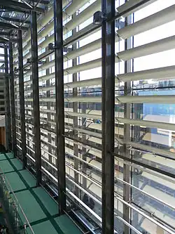 The south-facing entrance is fully glazed and creates a smooth transition from the square to the interior. To the east, a "slightly austere translucent glass box" projects slightly and is topped by an angled brise soleil.[5][10] Further to the east, the wing containing staff and conference rooms is faced with glazed blue tiles which imitate mathematical tiles—an 18th-century design element used frequently in Brighton but rarely found elsewhere.[10][22] The west side is the only other clearly visible elevation (it faces Jubilee Street); the ground floor is continuously glazed, and above this layers of blue and green imitation mathematical tiles are interspersed with windows at irregular intervals.[5][10] The tiles were glazed by hand in the local area. Architecture critic Hugh Pearman praised their use "at a time when every other building in the western world seems to have an off-the-peg terracotta skin".[11]