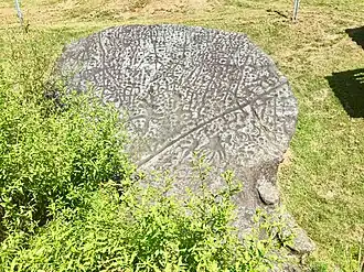The surface of the westward-slanting main boulder is covered with petroglyphs. It measures roughly 22 square meters (240 sq ft). The boulder carries scars resulting from soapstone bowl extraction. Three depressions show stem extraction to make pipes, and three more are hollow scallops.[3]