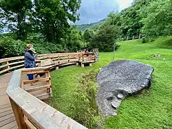 The petroglyph boulder is located on an old trail that linked the former Cherokee townhouse at Cullowhee, or "Juthcullah's Place," with Judaculla's reputed townhouse within Tannasee Bald (also known as Tsunegûñyĭ).[12] Today the federally recognized Eastern Band of Cherokee Indians is based in Swain and Jackson counties in Western North Carolina. They and the two Cherokee tribes in Oklahoma continue to regard this boulder as spiritually significant.