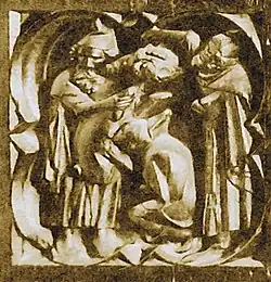 On the back of the Shrine of the Three Kings (1190–1225) is a scene, which shows the flagellation of Jesus Christ by two henchmen with Jewish hats. It is interpreted not because of the hats, but because of the caricature-like distorted faces of the henchmen. It is probably one of the first examples of overemphasised Jewish noses as an anti-Jewish stereotype.[12]