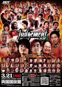 Judgement 2016: DDT 19th Anniversary (Judgement2016〜DDT旗揚げ19周年記念大会〜, Judgement 2016: hataage 19 shūnen kinen taikai) was a professional wrestling event promoted by DDT Pro-Wrestling (DDT). It took place on March 21, 2016, in Tokyo, Japan, at the Ryōgoku Kokugikan.[1][2] It was the twentieth event under the Judgement name. The event aired domestically on Fighting TV Samurai.[3]