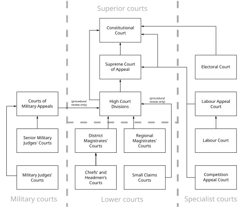 Chapter 8 of the Constitution of South Africa defines the structure of the South African judicial system.[3] This chapter also guarantees the independence of the courts and requires other organs of the state to assist and protect the courts in order to ensure their "independence, impartiality, dignity, accessibility and effectiveness". In addition, Chapter 2 of the Constitution guarantees every person the right to have a dispute or trial heard by a fair, impartial and independent court.