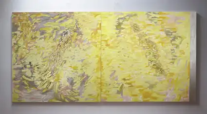 In the 2000s, critics continued to highlight Murray's lyrical expression, ethereal brushwork, sense of light, and increasingly, her sculptural use of paint, which lent her work depth, motion and a tangible physicality.[19][37][39][27] Alanna Heiss and Edward Leffingwell suggest that while Murray's subject is "paint itself," she simultaneously evokes real sensations such as evening light on water (the grays and calligraphic white marks of Primary Document, 2006) or the reds and pinks of a fiery sunset (Royal Flush, 2006).[19][37][39][27] The atmospheric work Magnetic South (2006), a sunny, fluctuating field of thick yellow and pink strokes, is often cited as a bravura display of the Murray's ability to achieve equilibrium and coherent structure through dense, abstract gestures and color organization.[37][27][19] The painting's creation—much of it on a ladder—was tracked over a three-month period in the episodic Albert Maysles/Mark Ledzian documentary, Judith Murray: Phases and Layers.[40][41]