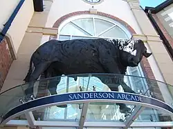 "Bull", commissioned for the Sanderson Arcade in Morpeth, Northumberland, is a life-size statue of an Aberdeen Angus bull, on a canopy above an entrance to the arcade. It was unveiled in November 2009, and is made of fibre glass resin to create the effect of bronze. It commemorates the history of Morpeth as an important cattle market for the region.[6][7][8][9]