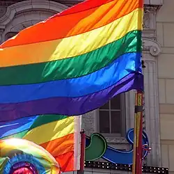 Another connection is the rainbow flag, symbol of the LGBTQ communities which may have been inspired, in part, by Garland's song "Over the Rainbow".[22] Garland's performance of this song has been described as "the sound of the closet", speaking to gay men whose image "they presented in their own public lives was often at odds with a truer sense of self that mainstream society would not condone".[9]