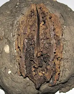 The fruit is a lemon-shaped nut, produced in bunches of two to six together; the nut is oblong-ovoid, 3–6 cm (1+1⁄4–2+1⁄4 in) long[5] and 2–4 cm (3⁄4–1+1⁄2 in) broad, surrounded by a green husk before maturity in midautumn. Rodents such as squirrels help distribute the seeds.[5]
