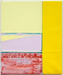 Julia Rommel is an American abstract painter.[3][4] Her early paintings were typically monochromes of blacks and muted colors.[5] Rommel make paintings of various sizes with cool to warm color palettes of blues, greys, reds and bright citrus hues.[6] She makes her paintings using a construction and deconstruction process.[7][8] Rommel’s laborious process of painting includes cutting and sanding the canvas, and wiping away and adding layers of paint.[6][9] Her working method stresses the canvas surfaces with physical manipulation, and admits frayed edges and staple holes.[6][9] Rommel allows imperfection in her painting which gives her work a handmade aesthetic.[10] “Whenever I approach what looks like an existing modernist painting, I know I have to change something,” says Rommel in an interview with Art in America, “I try to mess up the painting to prevent a fixed reading that reflects an established tradition.”[11]