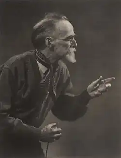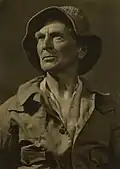 Smith's work served as material for discussion during the 1930s of the artistic worth of photography. Painter Arthur Streeton, reviewing the 1931 International exhibition of the Victorian Salon of Photograph at the Athenaeum Gallery, after a preamble supporting the idea that photography is art, chooses for his first comments Smith's The Painter, La Rixe ('The Brawl')[57] and Flight.[58] Of the same show watercolourist Blamire Young remarks on Smith's determination "to extract from his models the very utmost they can offer in the way of character and presentment. His lighting effects are still further systematised, and his control of his medium appears to be on the verge of the absolute," hailing his portrait of John Shirlow "as good as anything Dr. Smith has done. It shows the fine feeling for type which guides him in the selection of his sitters, and which so frequently places his work in the front rank," though, at odds with Streeton he condemns the "crudity of ... design" in La Rixe which "reminds of the gulf which still separates photography from fine art."[59]