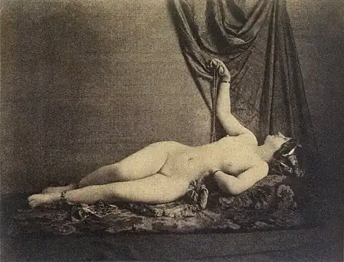 Realist painter Gustave Courbet was introduced to Vallou de Villeneuve's photographs by fellow artist Alfred Bruyas during the 1850s and used them as source material for his paintings,[12] in particular L'Atelier (1855) and Les Baigneuses (1853).[13] In 1954, the 27th Venice Biennale presented a large-scale retrospective devoted to Gustave Courbet;[14] one of the first major exhibitions devoted to the painter. Germain Bazin and Helene Adhémar (conservator, Department of Paintings at the Louvre) were the commissioners of ”A new century of vision[15]" which gave an essential place for artistic creations of the Second Empire. Jean Adhémar, curator, stressed that "first photographers are almost all painters, especially under Napoleon III". The section on “The times of Courbet, Manet, Nadar" was one of the richest in both the number of works presented - forty - and in the range of their subjects: it articulated the parallel between the realistic vision of the painter and the photographer. This was thus the first to attempt to identify the model in the nude photography requested by Courbet of Bruyas and mentioned for the first time by Pierre Borel in 1922.[16] A nude by Jacques Moulin (also exhibited) had previously been connected with the model in The Artist's Studio (L'Atelier du peintre): A Real Allegory of a Seven Year Phase in my Artistic and Moral Life (1855), by evoking the similarity of the models. But two photographs by Vallou Villeneuve, exhibited in the same section, where the model, Henriette Bonnion[17][18] poses in an attitude similar to that in Courbet's 'Bathers' (1853) and 'Artist's Studio' showed it likely (as subsequent studies have confirmed), that the Vallou model and not Moulin's was used by Courbet.[19][20]