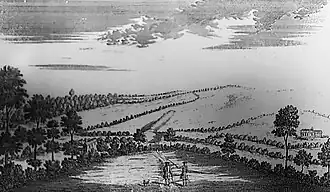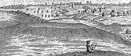 Other prominent antiquarians also made visits to the site. The antiquarian John Aubrey visited in about 1671 when staying at Hothfield with his friend and patron, Nicholas Tufton, 3rd Earl of Thanet. Aubrey then made reference to the site in his unpublished document on British archaeology, Monumenta Britannica.[68] In October 1722, the site was visited by the antiquarian William Stukeley, who made a drawing of the landscape around the long barrow; in October 1724, he returned to the site and produced a second sketch.[69] In May 1725 he again visited Chilham and on this occasion produced Prospect of Julaber's Grave from Chilham, a drawing from the vantage point of the Woolpack Inn. This and other drawings were converted into engravings by Elisha Kirkall and featured in Stukeley's publications.[69]