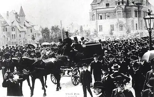 - Large crowds of Jews from many countries attended Theodor Herzl's funeral in Vienna.[65] 6000 people followed the hearse to Herzl's burial at the cemetery in Döbling. Herzl would be reinterred in 1949 on the hill in West Jerusalem now known as Mount Herzl.[28][29]