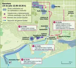 The loyalties of the city's 3,000 Civil Guards, led by José Aranguren, were initially uncertain.[56] Aranguren himself was still affiliated with the UME, while the Civil Guards had a reputation in Catalonia for political repression. As news of the coming coup began to circulate, Escofet took steps to ensure Aranguren remained loyal to the Republic.[51] In the end, the Civil Guard would largely remain loyal to the Republic,[57] including two notable units: the 19th Regiment, which counted 2 battalions based on Carrer d'Ausiàs Marc and commanded by Antonio Escobar; and its 3rd Regiment, which had a small squad in Barcelona, but was spread out all over Catalonia.[49]