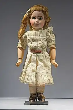 The Jumeau company first emerged as a partnership between Louis-Desire Belton and Pierre-François Jumeau in Paris in the early 1840s.[3] In 1844, Belton and Jumeau presented their dolls at the Paris Exposition (at which they received an honorable mention), but, by 1846, Belton's name was no longer associated with the dolls, and Jumeau was trading in his own right.[4] A bronze medal in the 1849 Paris Exposition followed, as did an appearance at the Great Exhibition in London in 1851, at which the company was awarded a First Place Medal.[4] Through much of this period, the firm sold only their own dolls to wholesalers, although during the 1850s and 1860s, the company moved into selling wax dolls imported from Britain.[5]