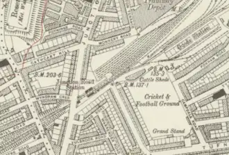 It was initially very heavily used, mainly owing to the nearby Metropolitan Cattle Market; at its peak, it was used in 1902 by over 140,000 passengers. When the nearby Tufnell Park Underground station was opened on the Charing Cross, Euston and Hampstead Railway (now the Northern line), passenger levels dropped drastically; in a 1937 poem, John Betjeman set a dark poetic lament at "this lonely station".[1] The station was closed on 3 May 1943 and demolished in the early 1950s; the only remaining evidence of the station are the name "Station Road" and the old Station Master's House on Junction Road.