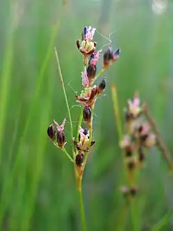 Juncus gerardii forms loose swards of erect tufts from dense and far-reaching matrix of black rhizomes.[2] Stems are slender and wiry, growing to 25-75 cm tall.[3] Leaves are narrow, channelled and with short auricles.