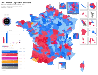 Legislative elections were held in France on 10 June and 17 June 2007 to elect the 13th National Assembly of the Fifth Republic, a few weeks after the presidential election run-off on 6 May. 7,639 candidates stood for 577 seats, including France's overseas possessions. Early first-round results projected a large majority for President Nicolas Sarkozy's Union for a Popular Movement (UMP) and its allies; however, second-round results showed a closer race and a stronger left. Nevertheless, the right retained its majority from 2002 despite losing some 40 seats to the Socialists.