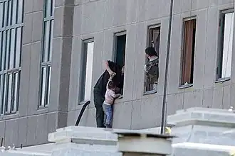 The building was subsequently surrounded by security forces. An Iranian member of parliament said that one of his staff was among the victims.[1] Iranian state television reported that one of the attackers had blown himself up inside the parliament building while parliament was in session,[4] while according to some other news agencies, the explosion could have been due to the grenades thrown by the attackers.[23] Associated Press reported that journalists at the site had seen police snipers on nearby rooftops. Shops in the neighborhood were closed. Eyewitnesses said that the gunmen were shooting at people in the street from the fourth floor of the parliament building.[4]