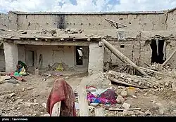 One hour after the mainshock, a mb 4.5 aftershock occurred 6 km (3.7 mi) south of the mainshock epicenter.[22] Another aftershock measuring mb 4.2 was recorded on 24 June.[23] It killed five people and wounded 11 more in Paktika, Afghanistan.[24] The strongest aftershock occurred on 18 July, measuring Mww 5.1, centred in Zerok District, Paktika Province.[25] Seven hours later, a mb 4.3 aftershock occurred south of the previous event.[26] The Mww 5.1 aftershock injured at least 44 people and destroyed 600 homes[27] which were previously damaged by prior earthquakes.[28][29] A spokesman for Afghanistan's Disaster Management Ministry said fewer casualties were expected as it occurred during the day, unlike the mainshock which struck at night.[30] Mohammad Amin Huzaifa, a provincial government spokesman, said Paktika experienced more than 30 aftershocks.[27] On 22 August, a mb 4.6 aftershock struck at a depth of 35.9 km (22.3 mi), destroying several homes in Ster Giyan.[31] On 23 August, a magnitude 4.6 aftershock caused several houses previously damaged by the mainshock in Gayan District to collapse.[32][31]