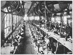 On 15 April 1861 Erhard Junghans created the company Junghans und Tobler together with his brother-in-law Jakob Zeller-Tobler in Schramberg.[2] In 1866, shortly before Erland Junghans died and his wife took over the company, the first Junghans watches appeared. She was succeeded by her sons, Erhard Jr. and Arthur, the latter of whom spent much time in the United States, where he learned innovative American production techniques that enabled the company to market affordable and popular timepieces to the German public.[3] The USA was also the inspiration for the five-pointed star as the Junghans logo, shortly to be replaced by an eight-pointed star, intended to symbolize a gear wheel, which is still in use.[4] By the year 1903, Junghans had the largest watch and clock factory, with over 3000 employees.[5]
