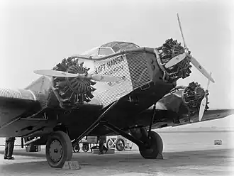 The Junkers G 31 was a trimotor all-metal low-wing monoplane passenger aircraft that shared its basic configuration with that of the preceding Junkers G 24.[5] Duralumin was the most commonly used material; others include cast electrum and silumin, which were used for relatively low-stressed complicated form pieces, less important fittings, and elements such as the bearing housings.[6] Corrugated sheets of duralumin covered the exterior of the wing, which was built in the-then typical Junkers technique, its structure comprising a tubular frame. A total of three exterior doors, one into the passenger cabin and two into the baggage hold, were present.[7]