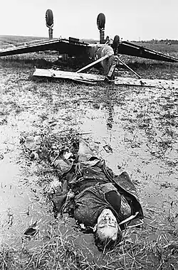 On 27 July 1936, Udet crashed the He 118 prototype, He 118 V1 D-UKYM.[18] That same day, Charles Lindbergh was visiting Ernst Heinkel, so Heinkel could communicate with Udet only by telephone. According to this version of the story, Heinkel warned Udet about the propeller's fragility. Udet failed to consider this, so in a dive, the engine oversped and the propeller broke away.[19] Immediately after this incident, Udet announced the Stuka the winner of the development contest.[18]