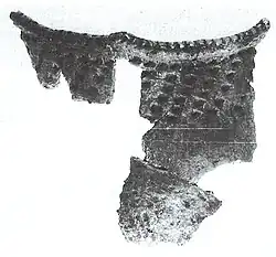 Eleven sherds representing a single vessel were present at Juntunen.[4] Ramey Incised is a Middle Mississippian pottery type first identified at the Cahokia Old Village site in southern Illinois. It has also been recovered at Carcajou Point in Wisconsin, but its presence at Juntunen marks the northernmost occurrence of any Middle Mississippian pottery type. Tempering is shell-tempered mixed with grit and decoration is a distinctive pattern of curvilinear designs. The vessel shape is thought to be a bowl with sharply defined shoulder. It was recovered in intermediate strata between the Bois Blanc and Juntunen Phases.[4][13]