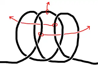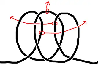 There are three closely related variations of this knot. They differ based on the type of crossing, overhand or underhand, of the three initial loops and then whether the edges of each loop is positioned over or under the previous one. Although these knots are tied in the bight, for the purposes of description the left side will be considered the standing part. If all the crossings and overlays are reversed, or the right side is taken as the standing part, a mirror image of the knot will result.