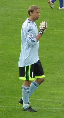 Ahead of the 2006–07 season, Jääskeläinen said the club can make an improvement for the new season and hope to qualify for Europe again.[134] From 9 September 2006 to 30 September 2006, he kept four consecutive clean sheets in the league.[135] For his performance, both Jääskeläinen and Speed were named Actim Premiership team of the month for September.[136] On 22 October 2006, he saved two penalties in one match from Blackburn Rovers' Benni McCarthy and Jason Roberts to secure a 1–0 away win.[137] After the match, local newspaper The Bolton News wrote positively about his performance, saying: "Faultless in everything he did in the first 87 minutes, he surpassed himself with two penalty saves in as many minutes to secure a famous victory. Whatever else Jussi Jääskeläinen achieves in his time with Bolton Wanderers, he will forever be remembered as the goalkeeper who saved two penalties in a famous derby triumph over Blackburn Rovers."[138] While manager Allardyce praised his performance and compared him to Peter Schmeichel.[139] From 9 December 2006 to 23 December 2006, Jääskeläinen kept four consecutive clean sheets in the league.[140] On 1 January 2007, he made his 300th appearance for the club, in a 3–0 loss against Liverpool.[141] In a match against Charlton Athletic on 30 January 2007, Jääskeläinen conceded an equalising free kick from Talal El Karkouri, as Bolton Wanderers drew 1–1; which he acknowledged his mistake after the match.[142] Having set a target for the club to qualify for the UEFA Champions League, Bolton Wanderers had spent much of the season, challenging for a Champions League and had peak as high as third, but poor results and the sacking of Allardyce saw the club drop out of the top four.[143] On 13 May 2007, Jääskeläinen received Bolton's "Player of the Year Award" and also the "Players' Player of the Year Award" after helping the club secure a UEFA Cup spot for only the second time in their history.[144] At the end of the 2006–07 season, he made forty appearances in all competitions. Following this, Jääskeläinen revealed that Bolton Wanderers opened talks with him over a new contract over his future at the club, with one more year left.[145]