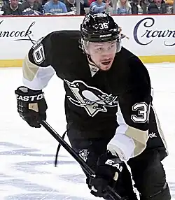 On March 26, 2013, Jokinen was placed on waivers by Hurricanes. On April 3, 2013, Jokinen was traded to the Pittsburgh Penguins in exchange for a conditional sixth- or seventh-round pick in 2013.[10] In his first game with the Penguins, Jokinen scored Pittsburgh's lone goal in regulation and tallied the only shootout goal for the team in a 2–1 victory over the New York Rangers.[11] During the 2013–14 season, on October 8, 2013, Jokinen scored his first hat-trick with the Penguins in a 5–2 win over his former team, the Carolina Hurricanes. Jokinen enjoyed his most productive season since 2010, totaling 21 goals and 57 points in 81 games with the Penguins, playing alongside Evgeni Malkin for most of the season.