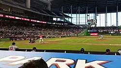Bour had a successful season in 2017, even having a couple firsts for his Major League career. One of the firsts for Bour was stealing a base, against the Arizona Diamondbacks. Bour stole second base and had the pitcher, Zack Greinke, and catcher, Jeff Mathis, sign the base for him.[10] Bour also was invited to participate in the 2017 Home Run Derby. Bour used what he called doughnut power during his home run derby competition and was even given doughnuts by his teammate Stanton during the competition. Bour hit 22 home runs in the first round, setting a record for the fourth-most home runs in that round, but was knocked out of the competition by Aaron Judge, who hit 23 home runs.[11] Bour finished the season with 25 home runs and 83 RBIs.[12]