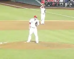 A fastball and a slider comprise De Fratus's pitching repertoire; his fastball averages about 93 miles per hour (150 km/h), but occasionally touches 95 miles per hour (153 km/h), while his slider is about 10 miles per hour (16 km/h) slower than that.[36] His slider was able to "dominate the league" in 2014, and although he does not total as many strikeouts as some relievers, he has established himself as a dependable piece in the Phillies' bullpen.[15] Early in his career, De Fratus aspired to be a closer, but after realizing that an "all-or-nothing" mentality was not necessarily conducive to success, he sought to relax more and focus on being a quality setup reliever, projecting confidence on the mound.[37] Especially in the Phillies' young bullpen, the need for reliable late-innings relievers was great, underscoring the importance of De Fratus's emergence.[35] He is most successful when he utilizes a lower arm angle, and works quickly on the mound.[16]