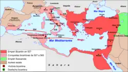 The Byzantine Empire at its greatest extent since the fall of the Western Roman Empire, under Justinian I in 565 AD. Emperor Justinian reconquered many former territories of the Western Roman Empire, including Italia, Dalmatia, Africa, and southern Hispania.