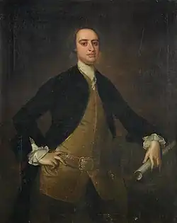 Justly Watson was the son of Colonel Jonas Watson, by his wife Miriam (bapt. 1686, died 1754), daughter of John and Anne West.[1] Jonas Watson (1663–1741), served over fifty years in the Royal Artillery, and after distinguishing himself, first in the campaigns of William III in Ireland and in Flanders, and then in those of Marlborough, succeeded to the command of the artillery of the train. He was promoted lieutenant-colonel on 17 March 1727, and commanded the artillery at the Siege of Gibraltar in that year. He was employed in the command of the artillery on several expeditions until he was killed at the Siege of Carthagena on 30 March 1741.[2] He bequeathed his books, maps, and "instruments relating to the affairs of artillery" to his son.[1] He left a widow, Miriam, and a family of children. His widow was granted a pension of 40l. per annum in acknowledgment of her husband's services.[2]