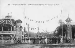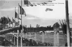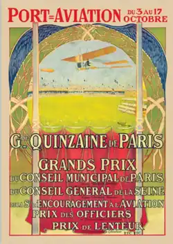 Of the many aviation events held at Port-Aviation, the most notable was the Grande Quinzaine de Paris ("Great Fortnight of Paris") of October 1909, for which the grandstands were expanded and decorated.[4][24] Organizers originally scheduled the event for 7 to 21 October, but the large number of entrants prompted them to expand the schedule, with testing and training days from 3 to 6 October followed by official events from 7 to 21 October.[25] The Grande Quinzaine drew huge crowds, including a record number[26] of spectators on 10 October, estimated by the weekly newspaper L'Illustration at 100,000 and by the magazine L'Aérophile at 250,000 to 300,000; with the surprised railway lines overwhelmed, visitors were packed into trains and cattle cars and many did not reach Port-Aviation at all.[24]